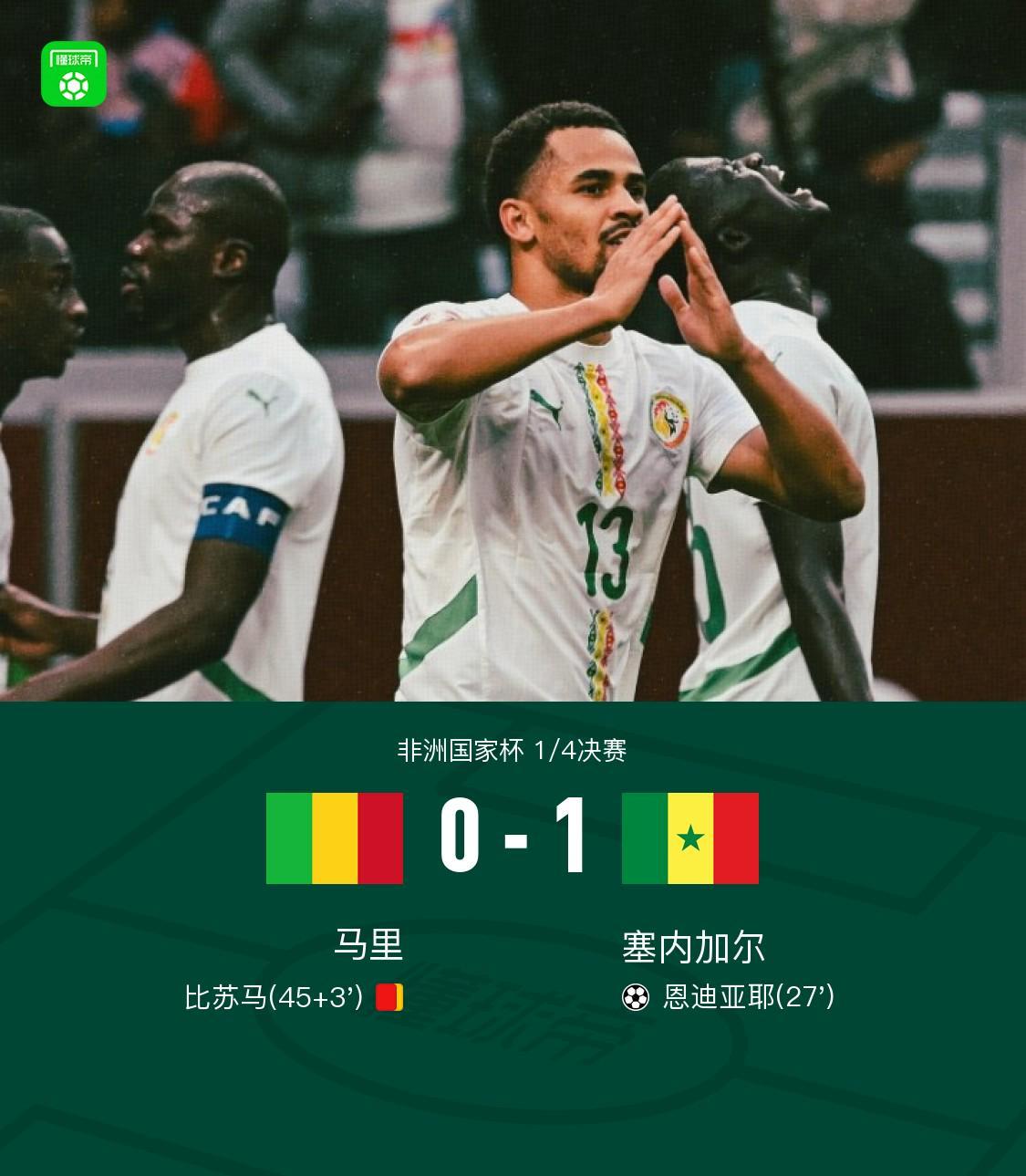 塞内加尔1-0十人马里晋级四强,恩迪亚耶制胜,比苏马染红
